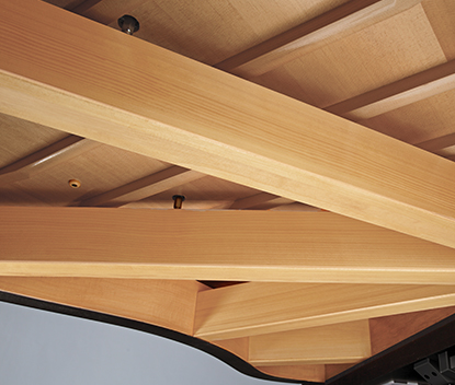 Spruce is known for its outstanding ability to conduct and conserve sound energy. However, it is generally considered too precious for use as a structural material. For the Shigeru pianos, all of the underside beams are made entirely of the highest quality spruce.