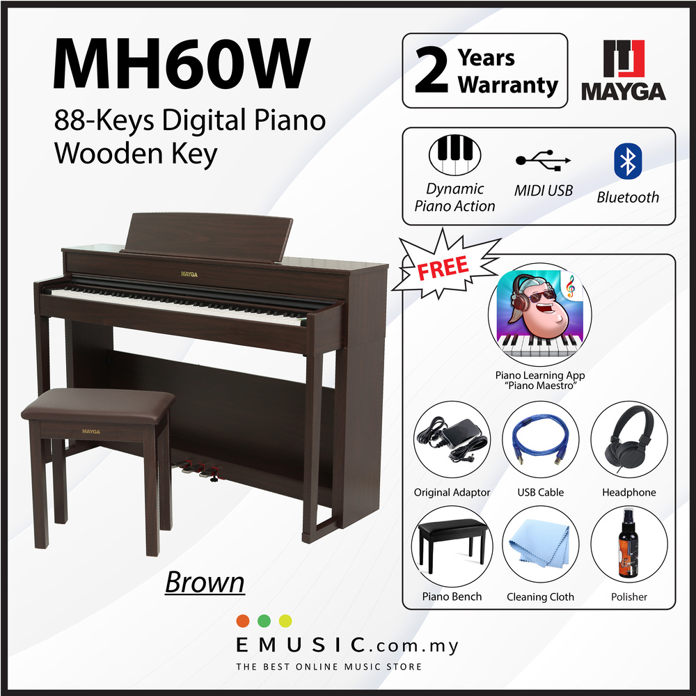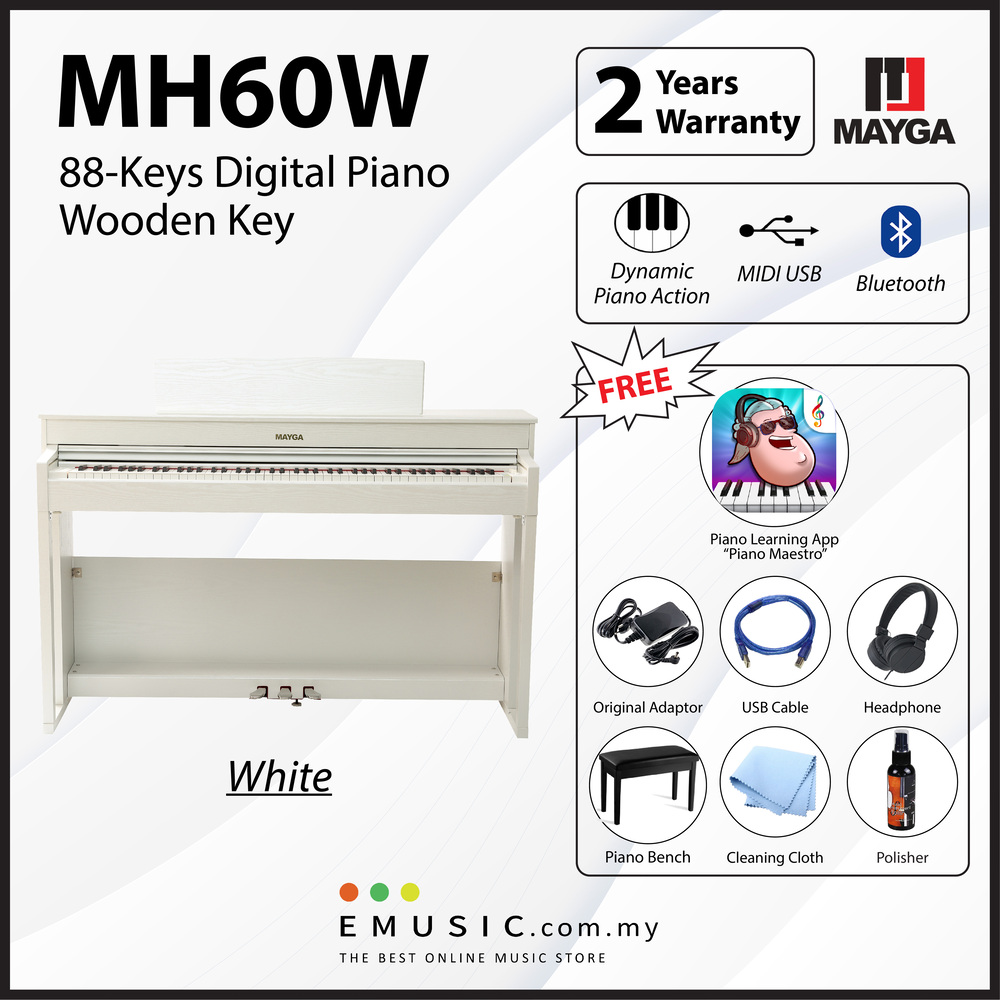 Introducing the MAYGA/MAYGA electronic piano, model MH-60w. It features a sleek design with a matte PVC finish, an 88-key progressive center-weighted keyboard, and 256 maximum polyphony. The piano has 128 types of voices, 120 types of rhythm, and 30 demo songs with 100 Czerny songs. The PETROF grand piano/multi-sampling enables you to choose from seven different styles of piano tones. The piano has a recording capacity of five tracks and is supported by computers, tablets, phones, mixers, recording equipment, and APP software.