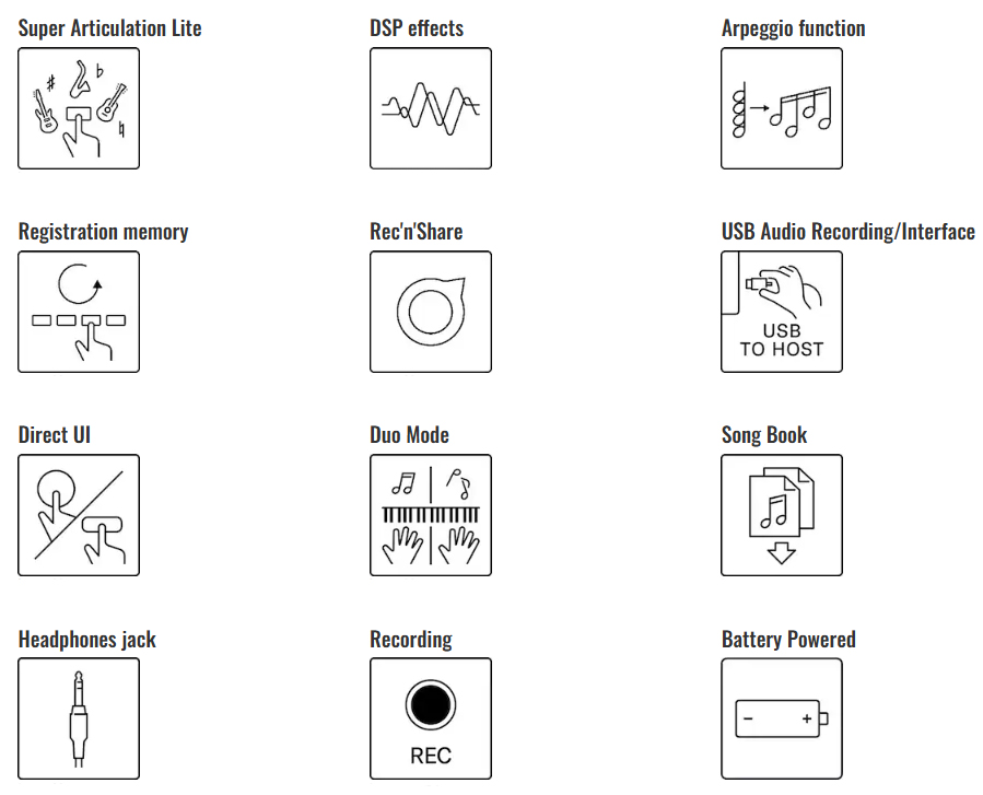 | Miscellaneous | PIANO Button: Yes (Portable Grand Button) |
